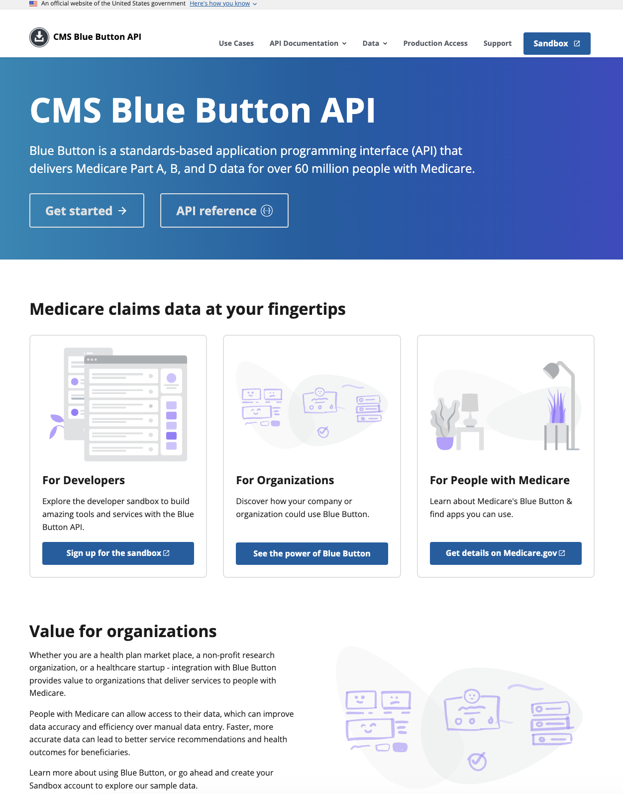 We spent several sprints mocking up and testing key user flows and improved documentation for a single website: ab2d.cms.gov. We could extend these learnings and to other API websites down the road to save time and to reinforce standardized practices.