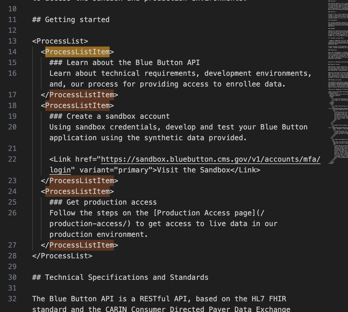 We used Markdown and TypeScript to create intuitive code components that extended USWDS within guardrails, allowing non-technical teammates to easily contribute code. This was heavily influenced by GOV.UK's Govspeak.